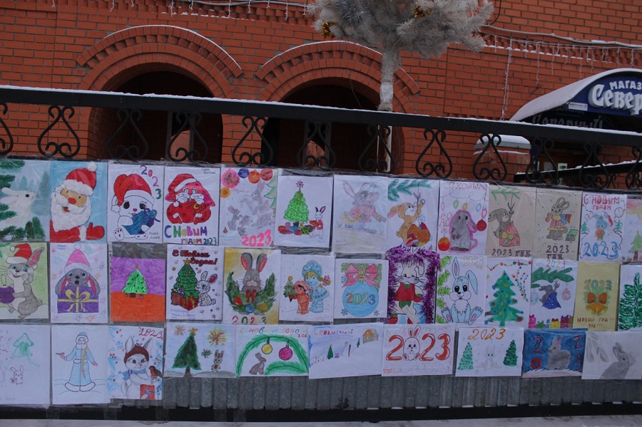 Более 60 ребят в возрасте от 2 до 14 лет прислали свои работы, главным героем которых являлся, конечно же, кролик. Из рисунков была образована настоящая художественная галерея под открытым небом. Дед Мороз и Снегурочка помогли создать праздничную атмосферу и сказочное настроение. Мальчишки и девчонки с удовольствием водили хоровод вокруг елки, танцевали, разгадывали загадки и пели.