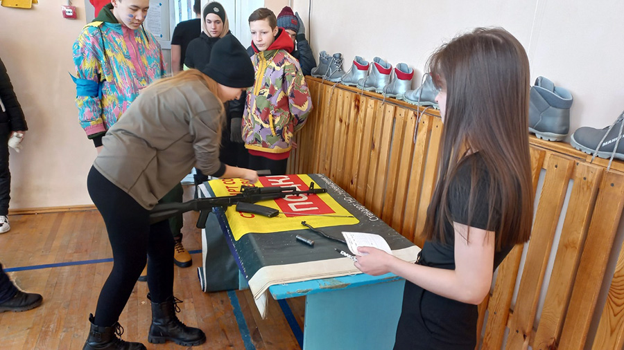 Ученики 5 — 11 классов Егорьевской средней школы были разделены на 2 команды: «синих» и » зеленых». Команды соревновались в исторической викторине, стрельбе, разборке-сборке автомата, оказании медицинской помощи, надевании противогаза.