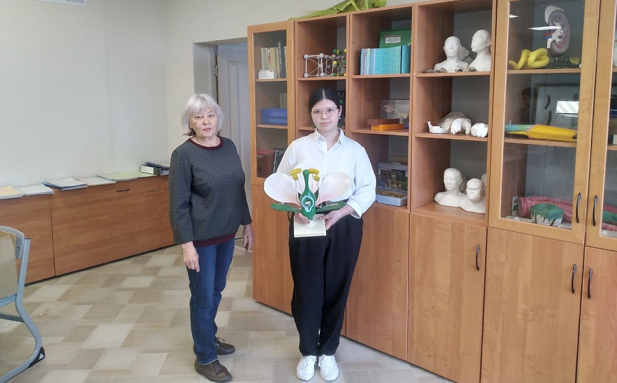 Классный руководитель Любовь Ивановна Великороднова тоже, как может, поддерживает юный талант. Из недавних достижений девочки можно отметить яркую победу в областной олимпиаде по биологии.