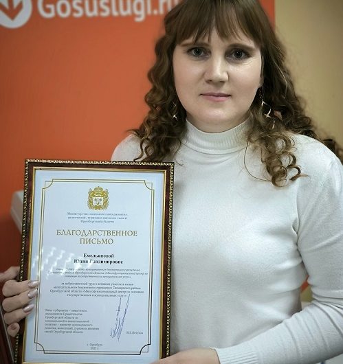 Особым вниманием в этот день была отмечена работа главного специалиста Юлии Владимировны Емельяновой. За добросовестный труд, активную жизненную позицию и в связи с празднованием 8-летия со дня открытия МФЦ Сакмарского района Юлия Владимировна была награждена Благодарственным письмом Министерства экономического развития, инвестиций, туризма и связей Оренбургской области.
