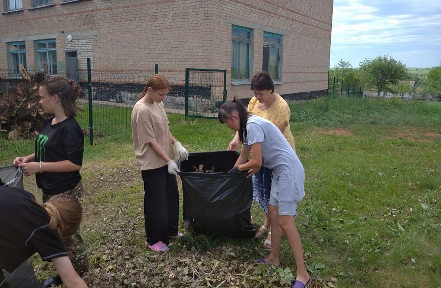 Юноши совместно с Альфией Амановой работали на территории школы: облагораживали школьный сад, зелёные насаждения. А в заключение дружно очистили спортивную площадку от травы.