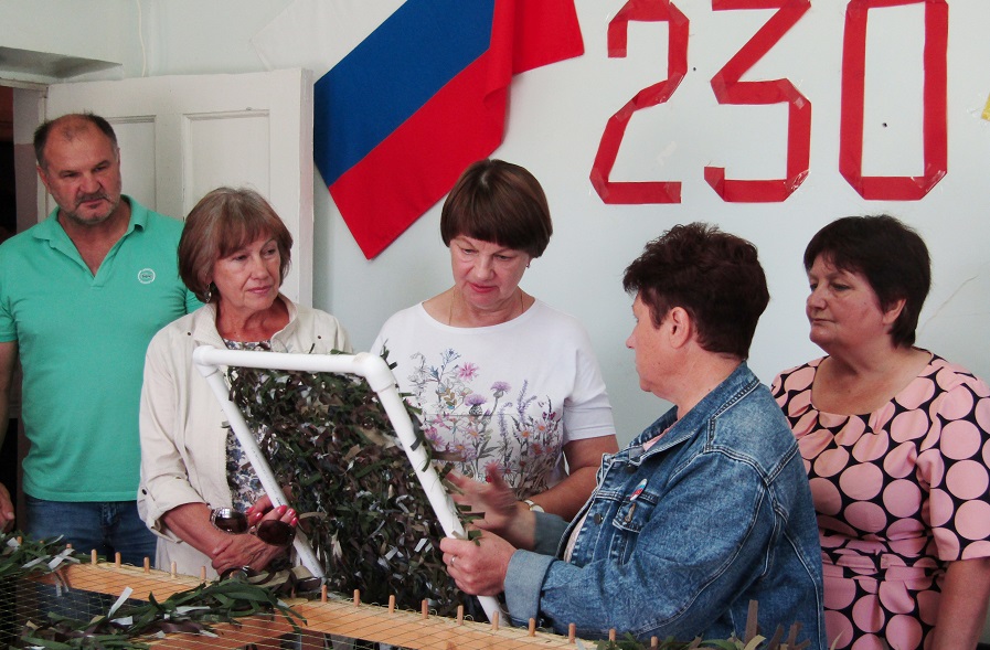 Почетные гости во время визита посмотрели, как работают волонтеры, даже поучаствовали в изготовлении маскировочной накидки «Птаха». Поинтересовались условиями быта, как изготавливаются масксети, нашлемники, спецхалаты. Отметили, что это очень кропотливая работа, которая требует времени, но при этом у каждого волонтера свои семьи и домашние хлопоты.