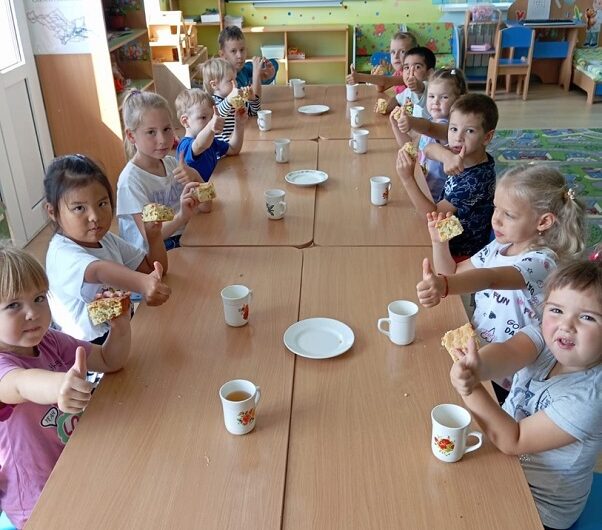 Накануне, ребята старшей группы «Буратино» собрали сочный краснобокий урожай с местного яблоневого сада и приготовили вкуснейшую «Шарлотку». Конечно, не обошлось без присмотра и помощи воспитателя, но в целом, кулинарный шедевр приготовлен руками самих детей!