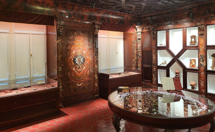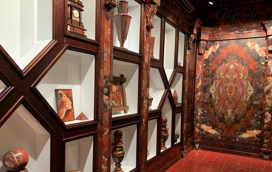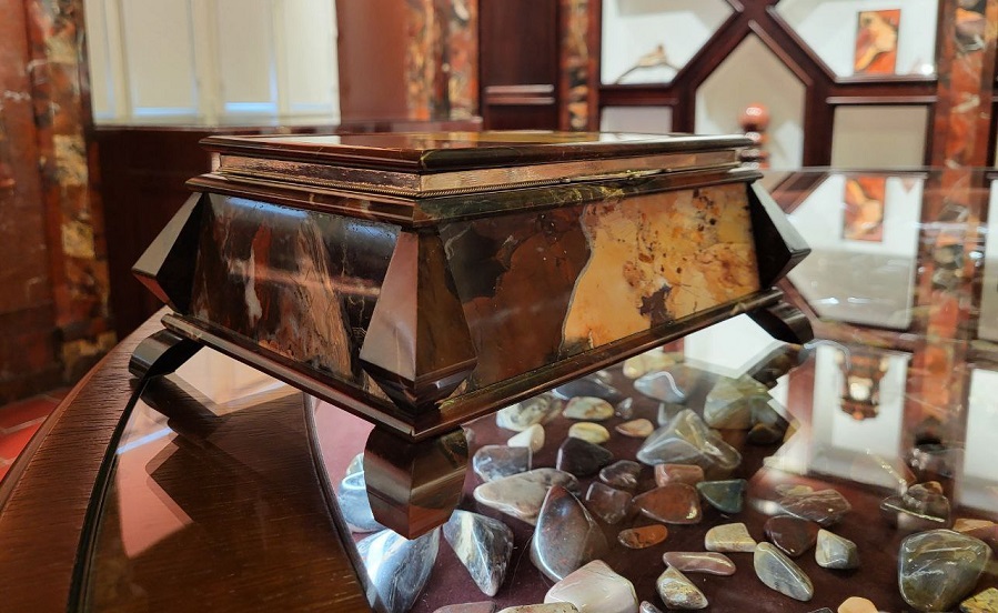 Орская яшма уникальна наличием синего и телесного цветов. 75 м² комнаты выложены плиткой шириной всего 4 миллиметра. Создавался этот шедевр под руководством камнереза Николая Местяшева. Мастер также передал в дар для комнаты вазы, шкатулки и часы из яшмы. Их особенность в том что они полые. Это просто ювелирная работа.