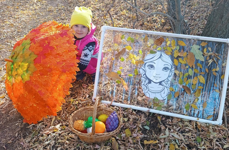 Совместно с воспитателем создали осеннее панно «Королева Осени». Малыши собирали красивые листья, веточки, цветы, которыми украшали волосы осенней королевы.