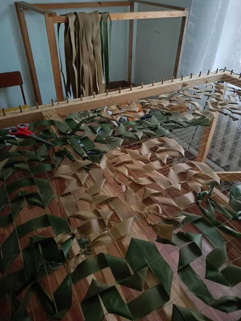 Так началась совместная плодотворная работа, которая продолжилась при кураторстве Елены и Сергея Филипповых из АНО «Братишка». Начались кропотливые будни по изготовлению маскировочных сетей – это уникальная ручная работа, ведь благодаря нестандартному рисунку дроны не распознают узор и тем самым уже многие жизни наших военнослужащих были спасены.