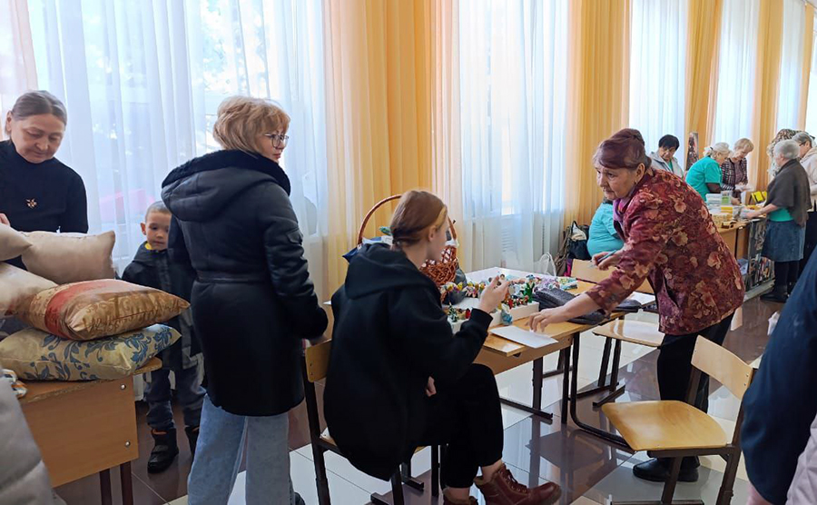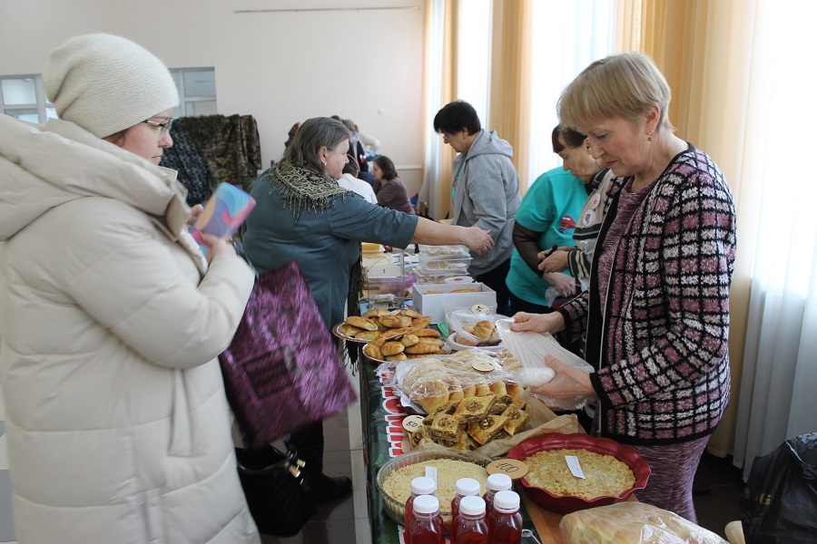 В фойе развернулась бойкая торговля изделиями ручной работы, выпечкой и сувенирами, созданными местными мастерами и волонтерами Сакмарского района. Аромат свежей выпечки смешивался с энергичной атмосферой, где каждый желающий мог приобрести уникальные вещицы, зная, что его вклад пойдет на благое дело.