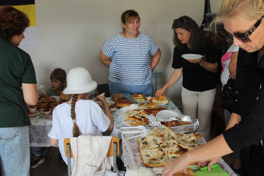 Здесь был накрыт изумительный стол с традиционными сакмарскими пирогами, арбузником, ароматным чаем, приготовленным в самоваре на дровах и другими вкусностями. Для немного уставших путников это было как раз кстати. А задушевные разговоры единомышленников, песни под звуки аккордеона и развлекательная программа для самых юных экскурсантов придали встрече милые домашние нотки.