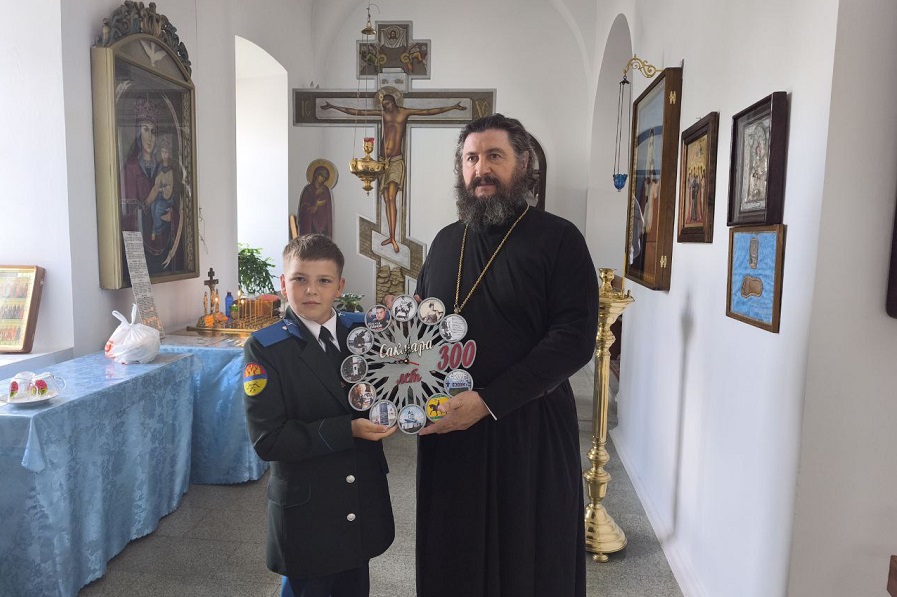 И начался он у сакмарского храма Казанской иконы Божией Матери, на чьих стенах совсем недавно расположилась новая достопримечательность села — мраморные плиты с именами сакмарских казаков Георгиевских кавалеров. Советник директора Сакмарской средней школы им. Героя России Сергея Панова Светлана Мажарцева рассказала присутствующим о героизме казаков в годы Первой мировой войны, а юный казак, ученик школы Владислав Болдырев вручил настоятелю храма отцу Василию праздничный сувенир — настенные часы с видами Сакмары, выполненные руками сакмарского предпринимателя Светланы Рассохиной.