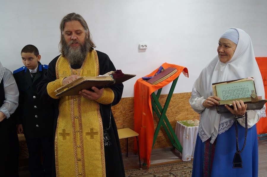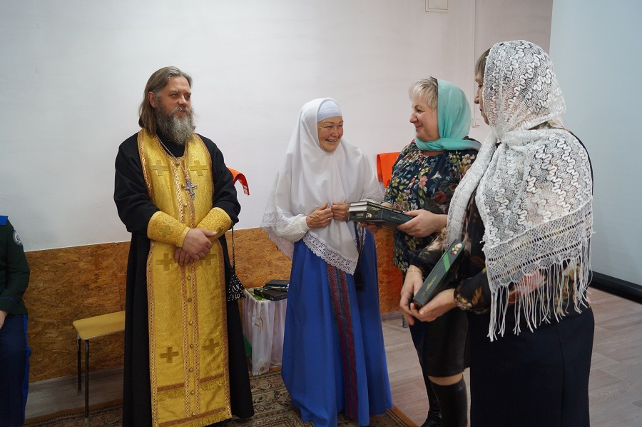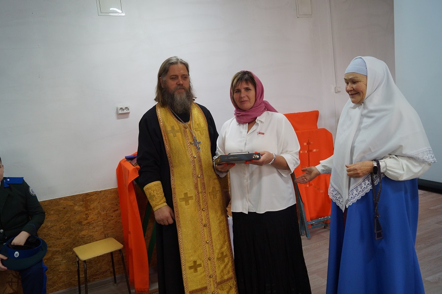 Отец Владимир и прихожанка Надежда Давыдова вручили подарки авторам небольшой художественной выставки, посвященной памяти боярыни Морозовой Ксении и Артему Сысоевым, казачатам, передали в фонд районной библиотеки книги о старообрядчестве.