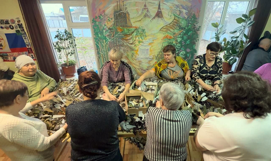 С самого утра гуманитарный автомобиль привез в поселок основы для сетей и рулоны специальной ткани. На месте уже шла активная работа: местные добровольцы занимались плетением маскировочных сетей, которые были завершены и погружены в тот же день. В отправляемый груз вошли не только маскировочные сети, но и продукты питания, теплая одежда, предметы первой необходимости и домашние заготовки.